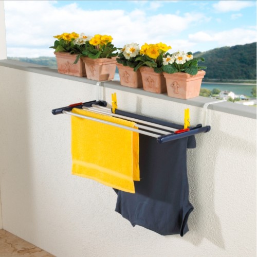 Universali džiovyklė tinkanti naudoti ant radiatorių, palangių, balkonų, duše, kempinge, ant durų. Galima ištempti pagal poreikį, ilgis 55 – 105 cm. Bendras virvių ilgis 4,2 m...