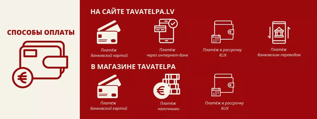 | Платеж банковской картой | Используйте оплату кредитной картой онлайн через банковский модуль или при получении товара в магазине LEIFHEIT по адресу: Рига,Улица Дамбья 3А. |